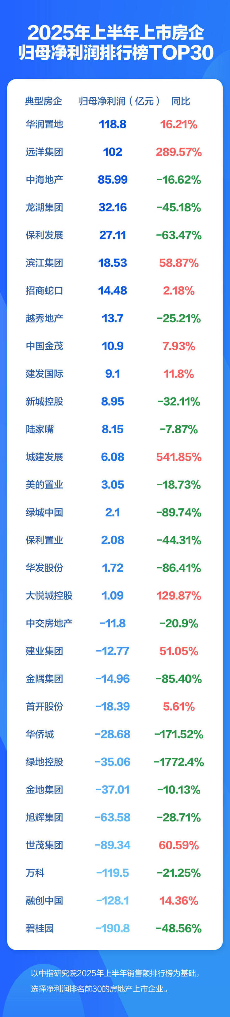 随着中报季结束,各大房企均披露了上半年的业绩表现。新京报贝壳财经以2025年上半年房企销售额排行榜(参照中指研究院公布名单)为基础,选取排名前30家的上市房企,推出《2025年上半年上市房企归母净利润排行榜》。