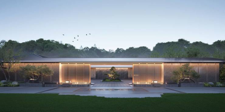 溪山赋项目依托三面环山的丰茂生态,以山水为脉络、礼序为骨架,用“三进三迎”的空间礼序与“三轴七境”的山水序列,将《千里江山图》的青绿意境、《兰亭集序》的雅集意趣,编织成可游、可赏、可居的生活长卷。