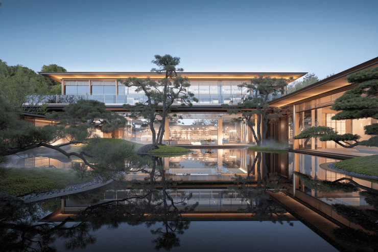 建筑形制也承"东韵西境":外立面高级石材配灵动线条,飘逸如东方画卷;屋顶"重檐歇山"制式,飞檐斗拱间嵌入现代金属,庄重中跃动未来感。雨天凭栏听雨打芭蕉,晴日闲庭信步赏竹影摇曳……生活的诗意,藏在每个可触的场景里。
