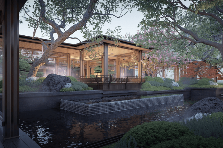 溪山赋依循“溪为脉、山为骨”的形制,将《千里江山图》的青绿意境、《兰亭集序》的雅集意趣融入景观:约46米恢弘门堂以中国画画格金属格栅为饰,叠石理水、曲水流觞的园林随步展开,每一步都是“可游、可赏、可居”的东方生活长卷。
