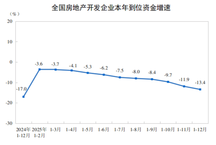 2025年,房地产开发企业到位资金93117亿元,比上年下降13.4%。其中,国内贷款14094亿元,下降7.3%;利用外资25亿元,下降20.8%;自筹资金33149亿元,下降12.2%;定金及预收款28089亿元,下降16.2%;个人按揭贷款12852亿元,下降17.8%。