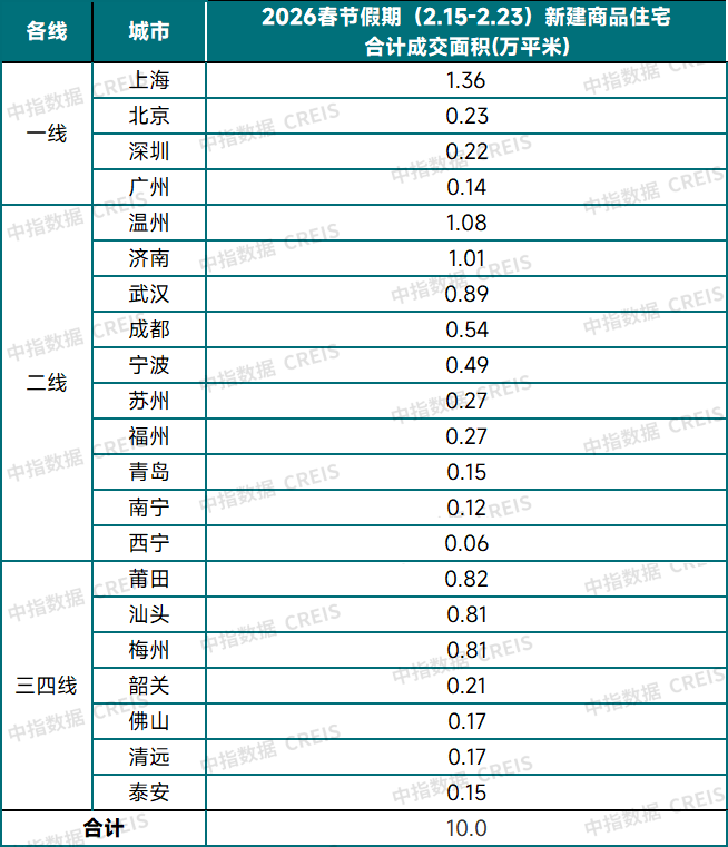 根据中指研究院数据,重点21城春节假期(2月15日-2月23日)新建商品住宅共网签成交10万平方米,相比去年春节假期日均成交量基本持平。